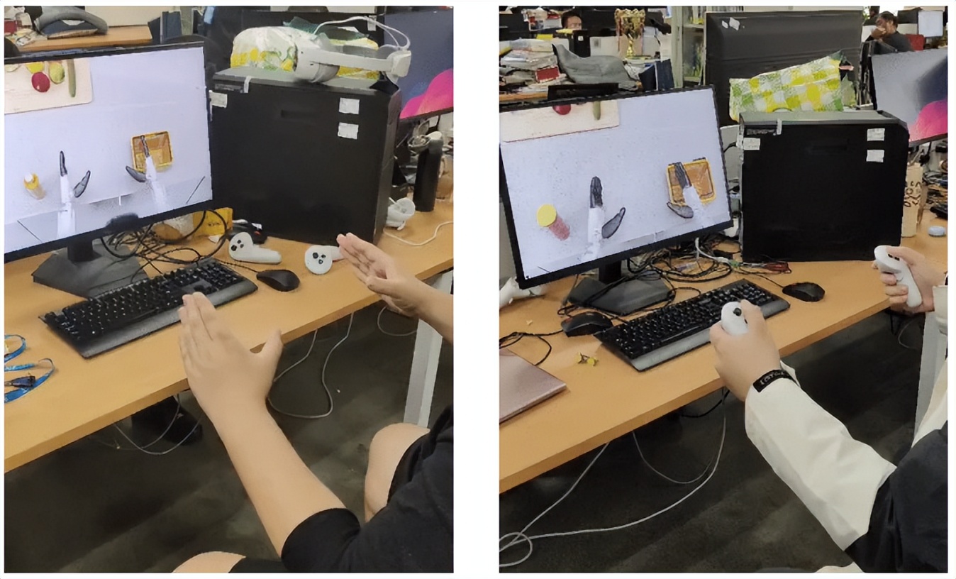 左图展示了基于手柄的VR遥操作数据采集系统;右图则展示了一种更精细的手势识别模式,适用于需要高精度控制的操作场景。