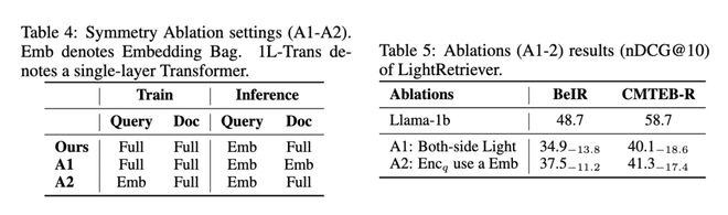 在 LightRetriever 的稠密检索中,Query 侧在训练时使用全量(Full)建模、推理时转化为 Embedding Layer(Emb)高效化推理。为了验证这种设计的合理性,文章进行了以下两组消融实验: