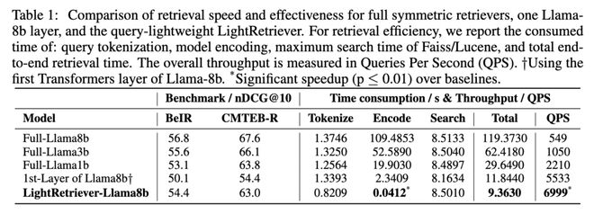在 MSMARCO 检索场景下对 64k 查询进行检索,完整的 Llama-8B 查询编码需要超过100 秒;而 LightRetriever 的查询编码时间仅为0.04 秒,对应超过 1000×的编码加速。即便考虑 Faiss 与 Lucene 的检索时间,端到端吞吐仍然获得了10× 以上的 QPS 提升。文章还尝试了一个经典的 Transformers Layer 裁剪 Baseline:在 Query 侧只用 Llama-8b 的第一层 Transformers Layer 用于训练和推理。然而,这个设置的检索性能和 QPS 均不如 LightRetriever,因为训练时 Query 侧没有完整的 LLM 建模。这证明了文章中 “训练全量 + 推理轻量” 的设计的合理性。