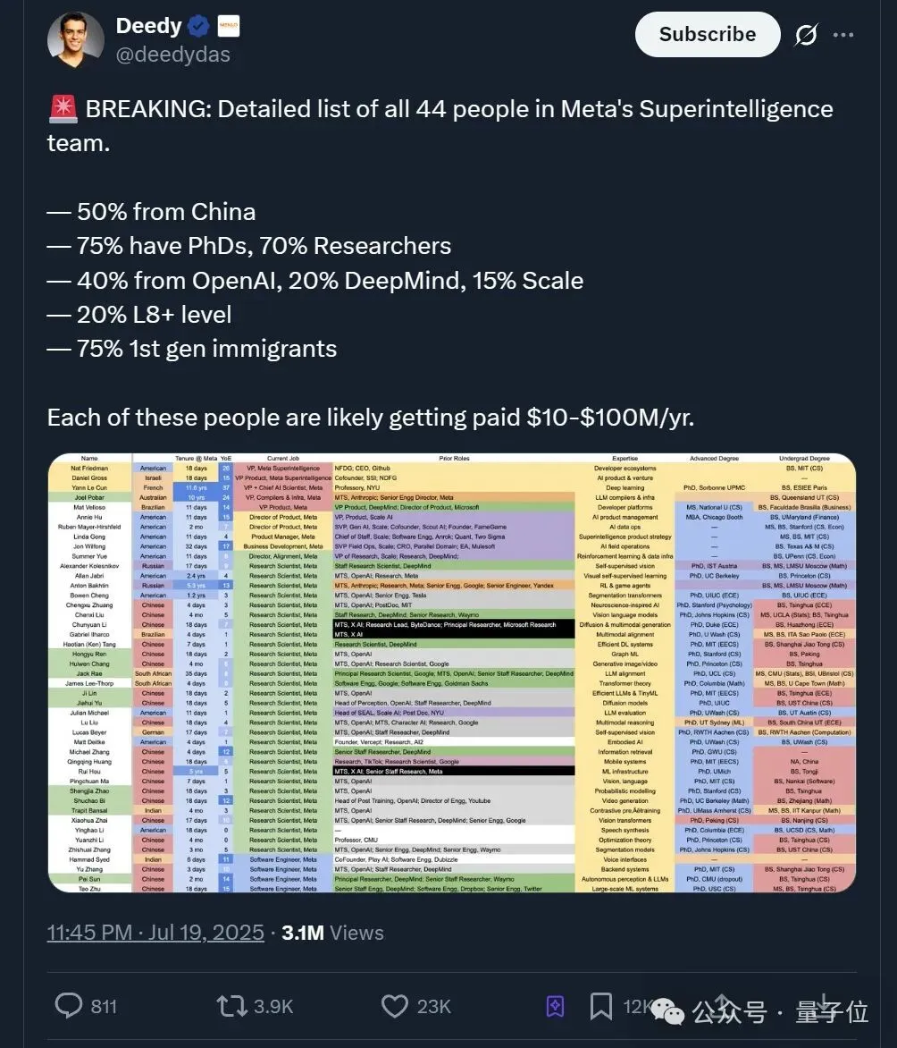 去年7月,硅谷一位著名的风险投资人Deedy从一名匿名的Meta内部人员处获取了一份超级团队成员名单。在这44人中,约有40%的人来自OpenAI,这表明该公司是被挖角最严重的机构之一。