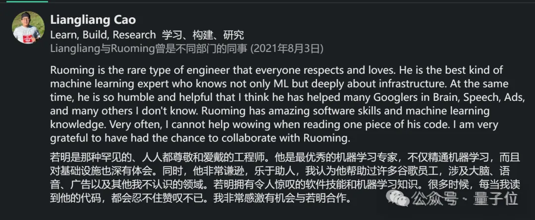 谷歌同事对其评价颇高,称庞若鸣不仅擅长机器学习技术,还具备深厚的基础设施知识。
