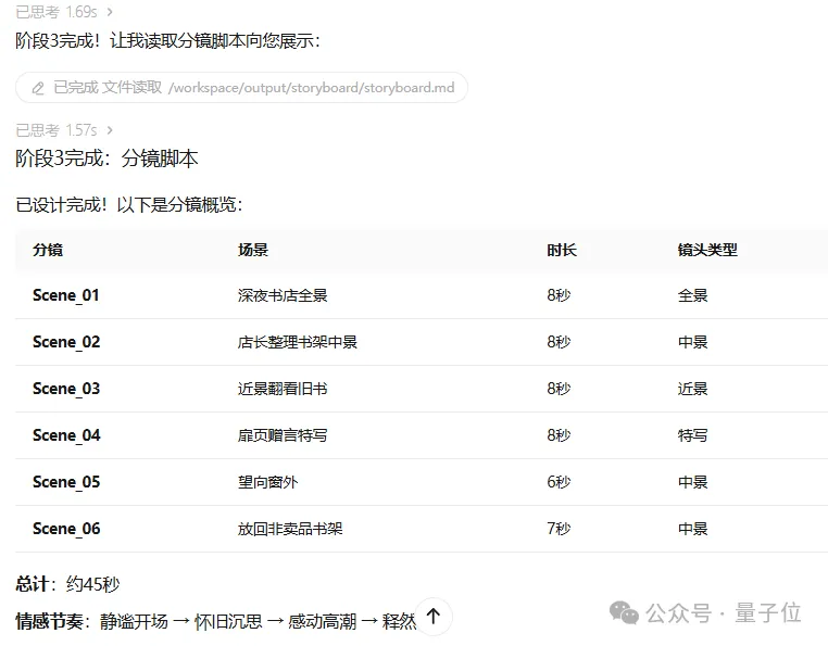 而在设计完这些参考元素之后,也就到了分镜环节。这里可以看到,Expert调用了一个专门用来设计分镜的子模块,输入给它一段超长的指令。