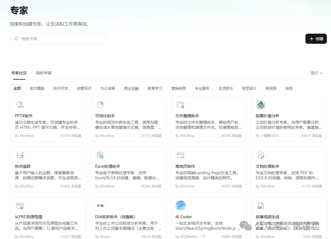 MiniMax Agent构建出的社区生态系统吸引着各行各业的专业人士将自己的知识、经验和技能封装成普通人可以一键调用的专家智能体。