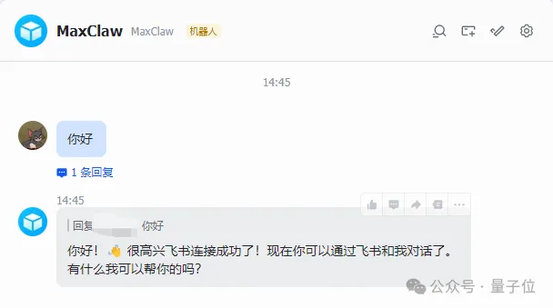 接入成功之后就可以直接发送消息给MaxClaw并获得回复了。