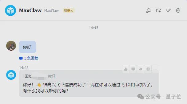 成功连接之后,用户可以通过飞书与MaxClaw互动并接收回复信息。