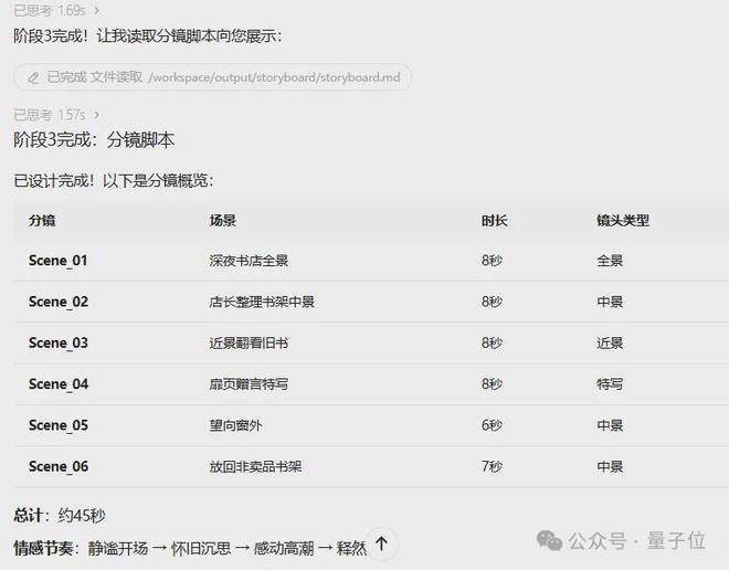 这里挑选了一个较为复杂的任务,涉及文案创作、分镜头设计及生成图片、音频和视频等环节。