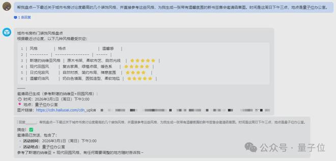 提示:请列出最近关于城市书房讨论度最高的几个装饰风格,并根据这些风格为我设计一张带有温馨氛围的新书签售会邀请函草图,时间定于本周日(3月1日下午三点),地点在量子位办公室内。