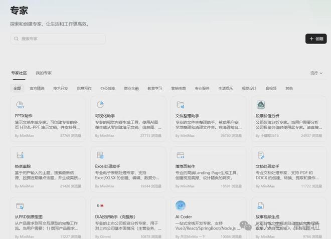 目前系统中已有超过一万个公开可用的专家,由MiniMax官方和社区用户共同创建。
