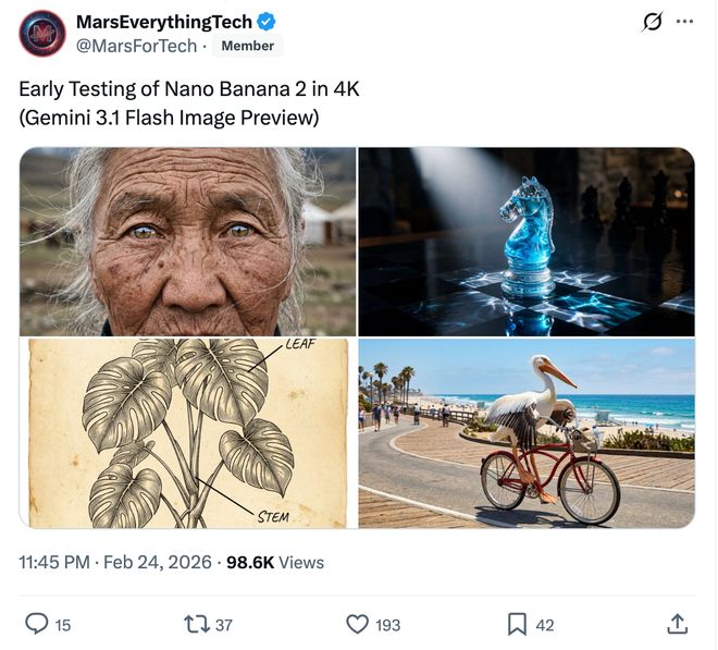 在海外社交平台X上,关于谷歌即将发布的最新图片生成模型(即Gemini 3.1 Flash Image预览版)的消息不断涌现,4K图片广泛传播,引发了各种猜测和讨论。