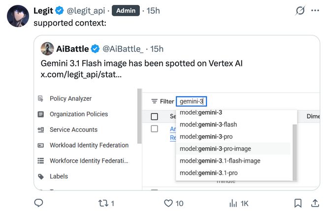 同时他还分享了在谷歌云的企业级AI平台Vertex AI网站上找到的证据,证实已存在Gemini 3.1 Flash Image镜像。如图所示,在输入“Gemini-3”后下拉页面会出现Gemini 3.1 Flash Image模型的名字。