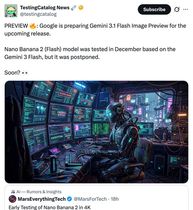 AI领域内广受关注的自媒体TestingCatalog News今日在其推文中指出,谷歌正在为即将发布的Gemini 3.1 Flash镜像预览版做准备。基于Gemini 3 Flash的Nano Banana 2(Flash)模型在去年十二月进行了测试,但随后推迟了发布日期,可能很快就会正式推出。该自媒体还附上了一张疑似由Nano Banana 2生成的图片。