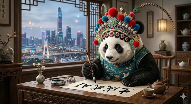 提示词:一只戴着中国传统京剧头饰的可爱大熊猫,正坐在现代中式茶馆里,用毛笔在宣纸上书写汉字“生成式AI”。要求熊猫的毛发丝丝入扣,头饰上的珠翠和绒球质感真实,写出的毛笔字“生成式AI”笔锋流畅且没有错别字。茶馆窗外是模糊的未来都市景象(深圳天际线)。画风要求是超写实摄影与工笔画融合的风格。