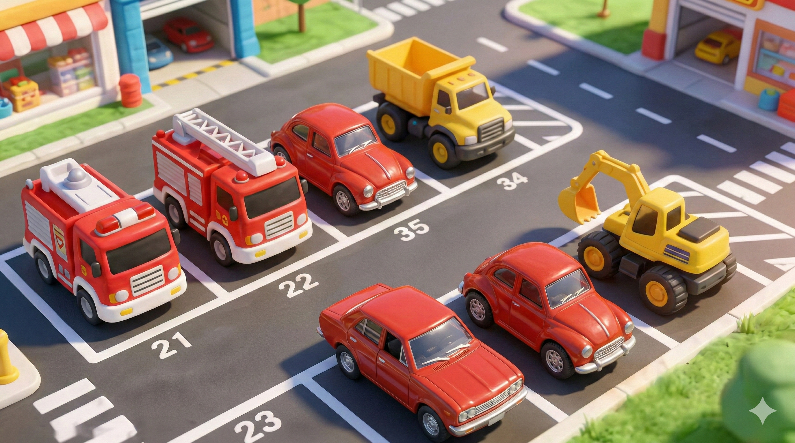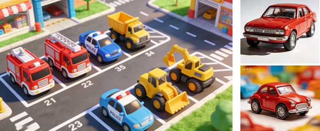 提示词:将图1中停车场中的小车替换为图2、图3中的小车,要求画面风格一致,符合物理规律。