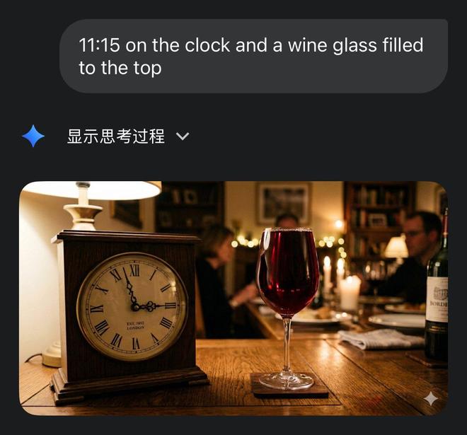 在使用提示词“传统时钟 21:35”后, Nano Banana 2能够精准地生成复杂的时钟图,解决了之前版本无法准确呈现的问题。但当面对更复杂的情景如“时钟+满杯红酒”的问题时,模型仍然存在一定的挑战。