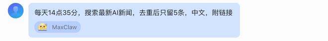 接入完成后,我在对话框里输入:“每天14点35分,搜索最新AI新闻,去重后只留5条,中文,附链接。”MaxClaw立即回应了该信息,并留下了一个“敲键盘”的状态。