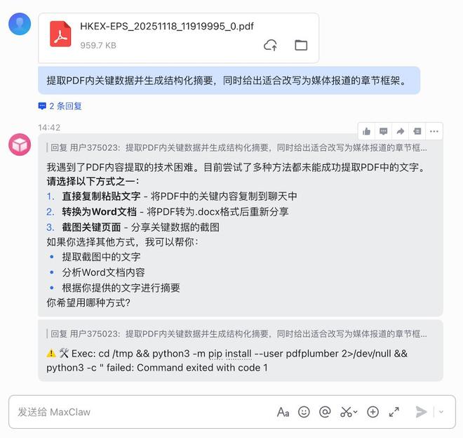 这次体验暴露了一个问题:在复杂文档处理上,MaxClaw的能力仍依赖于底层工具链的稳定性。如果是可直接读取文本的PDF,理论上可以完成结构化提取;但在实际测试中,面对这份文件,它未能顺利完成自动解析,反而需要人工介入转换格式。