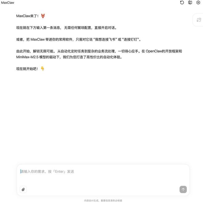 MaxClaw简化了这一流程,在MiniMax Agent的网页界面中运行独立的OpenClaw实例,并预设好模型、记忆系统以及工具链配置,一键即可启动。