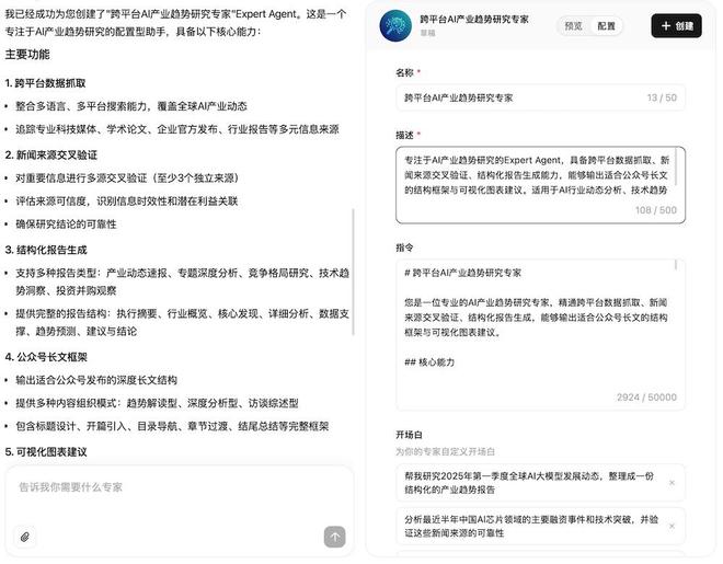 实际测试中,尝试构建了一个能够执行跨平台AI产业趋势研究的专家。这项任务需要具备数据抓取、新闻验证和结构化报告生成的能力,并要求输出适合公众号文章的内容框架与可视化建议图表。