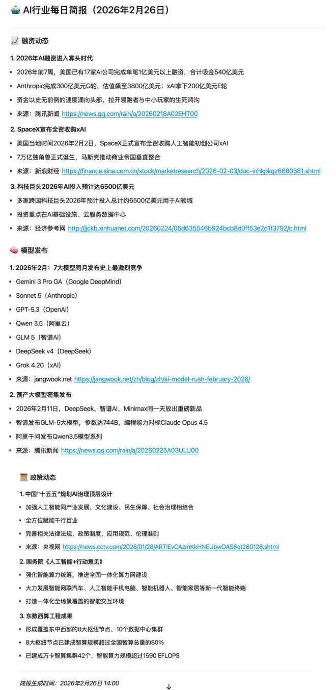MaxClaw确认“任务已创建成功”后,在后台通过Cron触发执行,随后生成了当日的AI新闻简报内容。