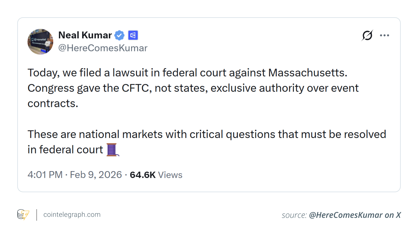 Polymarket 的首席法律顾问 Neal Kumar 称,这次争端涉及全国性市场和普遍性的法律问题,应由联邦法院裁决。该公司反对各州各自为政的执法行为,认为这些限制会阻碍行业发展。