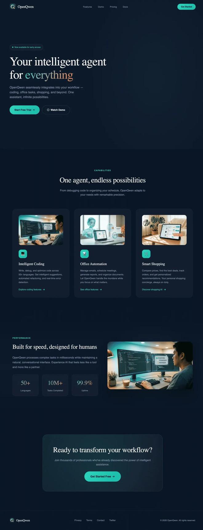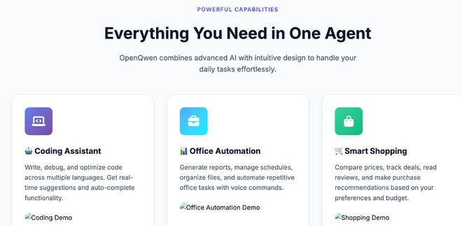 而后智东西着重考察了Qwen3.5-27B(Dense)的编程能力,让其生成一个“虚拟助手个人智能体OpenQwen的官方主页”,并提出“该助手可辅助编程、办公、购物等各类事务。生成高质量图片作为网站素材,包含智能体头像及功能使用场景演示”等特征。