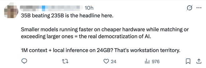 模型一经发布便在开发者社群引起热议。多位开发者表示这些模型的尺寸是本地推理的理想选择,他们称赞其“小而强大”,甚至有人预测Qwen3.5-35B-A3B将把每月费用从2000欧元(用于购买Gemini服务)降至50欧元,大幅节省成本。