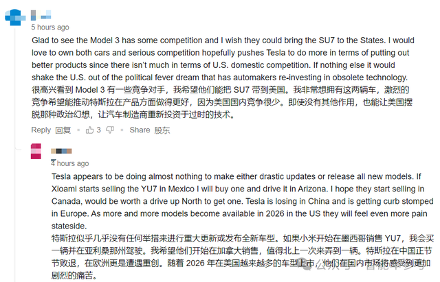 有人认为SU7超越Model 3对特斯拉而言是好事,激烈的竞争将促使特斯拉进行更多改进。