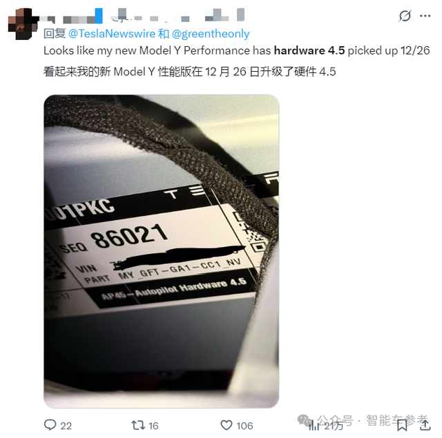 消费者爆料称,新提的2026款Model Y已经开始搭载新的HW4.5辅助驾驶硬件系统。