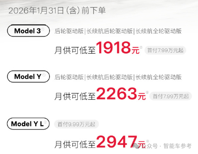 Model 3/Y首付为7.99万元起,月供为1918元起;长续航版Model Y首付为9.99万元起,月供为2947元起。