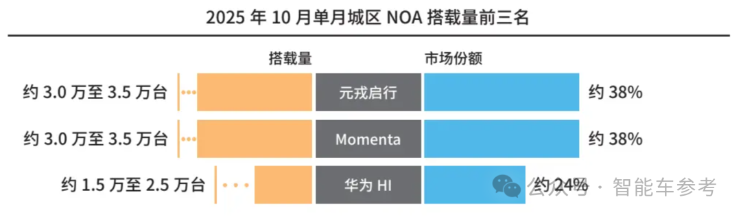 落地重点的变化也促使行业格局发生重大调整,头部效应开始显现。华为HI、元戎启行和Momenta在2025年1月至10月期间成为累计城区NOA搭载量前三名,合计占据市场超九成份额。