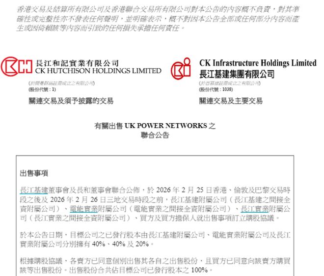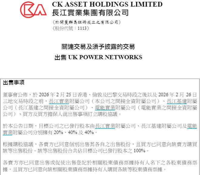 2月26日,李嘉诚旗下长和系的三家公司——长江基建集团、电能实业及长实集团在香港交易所发布了公告,宣布已与法国公用事业公司Engie旗下的子公司Engie UK 2026 Limited达成协议,出售其共同持有的英国电网企业UK Power Networks Holdings Limited全部股权,交易金额超过1100亿港元。